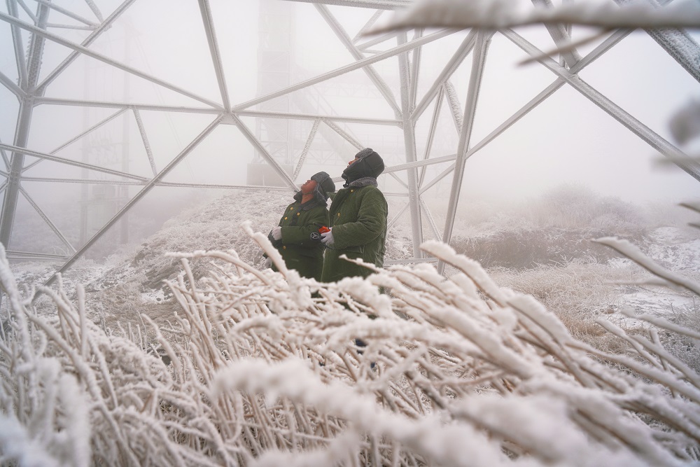 12月12日,國網(wǎng)運(yùn)城供電公司員工在110千伏金古線固定觀冰哨開展線路覆冰觀測(cè)。