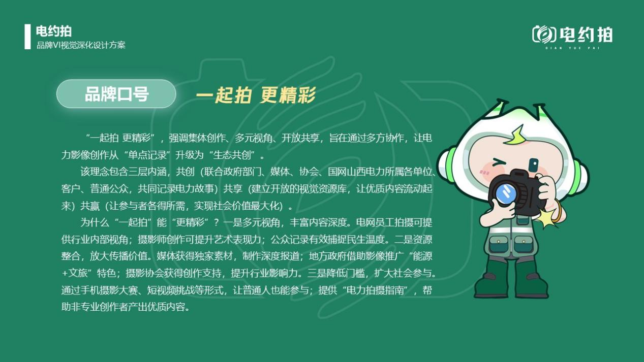 打造“電約拍”品牌,確定品牌定位、理念、愿景、口號(hào)、Logo、任務(wù),完成商標(biāo)注冊(cè),編制品牌手冊(cè),制作文創(chuàng)產(chǎn)品,通過(guò)聯(lián)合采風(fēng)、展覽推廣品牌。借助IP人物“晉電小新”影響力,增強(qiáng)作品內(nèi)容吸引力與互動(dòng)性,提升“電約拍”品牌知名度、認(rèn)可度。