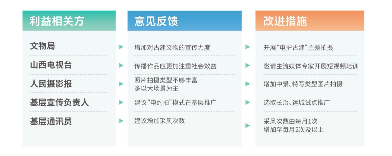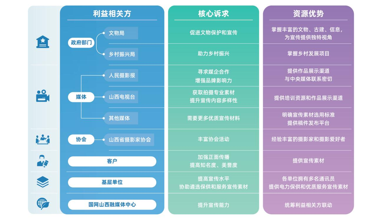 融媒體中心根植合作理念,將利益相關(guān)方拓展至政府部門(文物局、鄉(xiāng)村振興局等)、媒體(山西電視臺(tái)、人民攝影報(bào)等)、協(xié)會(huì)(山西省攝影家協(xié)會(huì)及市縣協(xié)會(huì)等)、基層單位、客戶(企業(yè)、人民群眾等),精準(zhǔn)識(shí)別分析各利益相關(guān)方的核心訴求與資源優(yōu)勢(shì),搭建多方溝通平臺(tái),確保溝通協(xié)作順暢,推動(dòng)形成優(yōu)勢(shì)互補(bǔ)、資源共享的合作格局。
