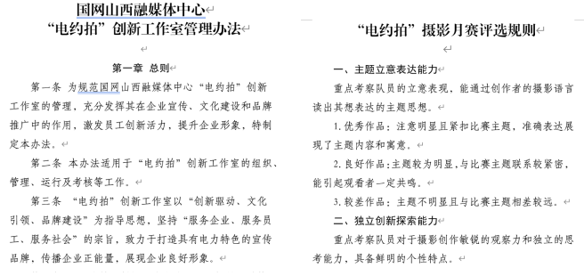 制定《“電約拍”創(chuàng)新工作室管理辦法》《2024年“師帶徒 青藍(lán)計(jì)劃”新聞采訪實(shí)訓(xùn)方案》《圖片資源管理系統(tǒng)管理辦法》《“電約拍”團(tuán)隊(duì)積分獎(jiǎng)勵(lì)辦法》《爭(zhēng)創(chuàng)“七個(gè)最”宣傳成果工作方案》《“為美好生活充電 為美麗中國(guó)賦能”攝影月賽評(píng)選規(guī)則》《“電約拍”采風(fēng)承諾書》等相關(guān)制度,通過(guò)完善的管理機(jī)制和制度,推進(jìn)了項(xiàng)目規(guī)范化運(yùn)營(yíng)、標(biāo)準(zhǔn)化管理。加強(qiáng)團(tuán)隊(duì)文化建設(shè),“電約拍——佳片有約”團(tuán)隊(duì)師徒8人,通過(guò)附加“葫蘆家族”情愫,打造出“記錄時(shí)代、匠心傳承”的團(tuán)隊(duì)文化。
