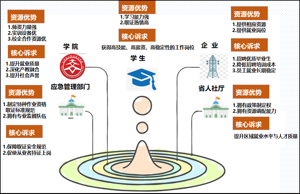 針對上述問題,學院精準識別利益相關方,通過“校政合作取證、校企合作育才、雙線協(xié)同育人”,開辟高技能、高薪資、高穩(wěn)定性的高質(zhì)量就業(yè)新賽道,為電力行業(yè)輸送優(yōu)質(zhì)高技能人才,回應“實現(xiàn)高質(zhì)量就業(yè)”的時代命題。