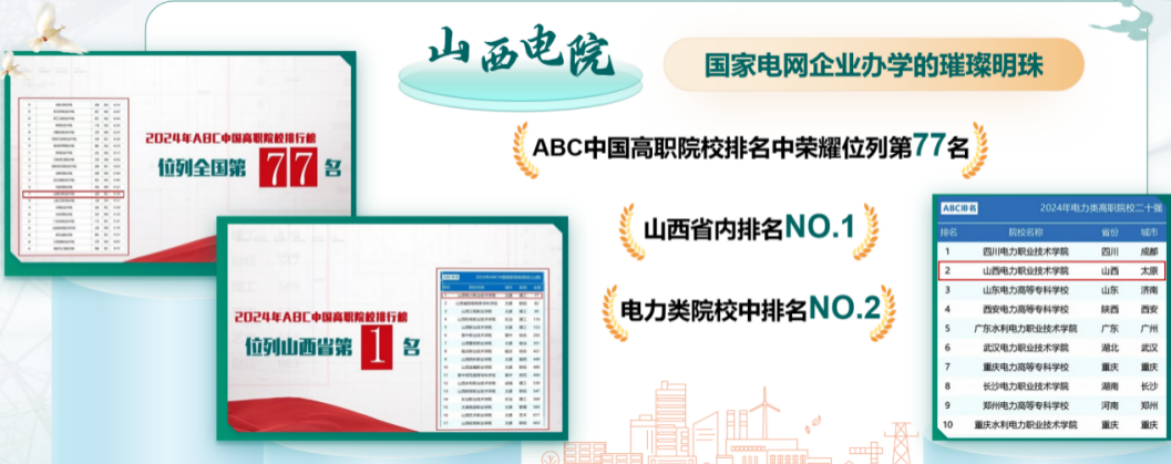 2024年ABC中國高職院校排名中,學院位列全國第77名、省內(nèi)第1名、電力類院校第2名。率先開展的“1+4”取證工作在全省51所職業(yè)院校及國網(wǎng)系統(tǒng)內(nèi)12所電力高職院校中獨樹一幟,形成可復制的高職高質(zhì)量就業(yè)“電院方案”,彰顯國網(wǎng)公司在教育領域積極履行社會責任、推動行業(yè)發(fā)展的擔當與作為。