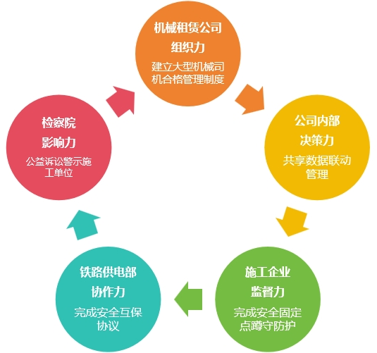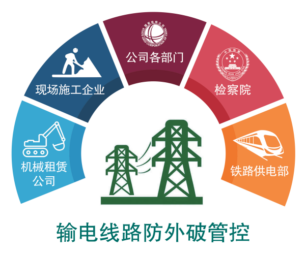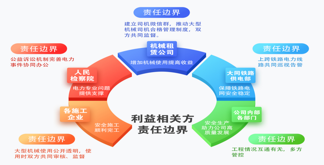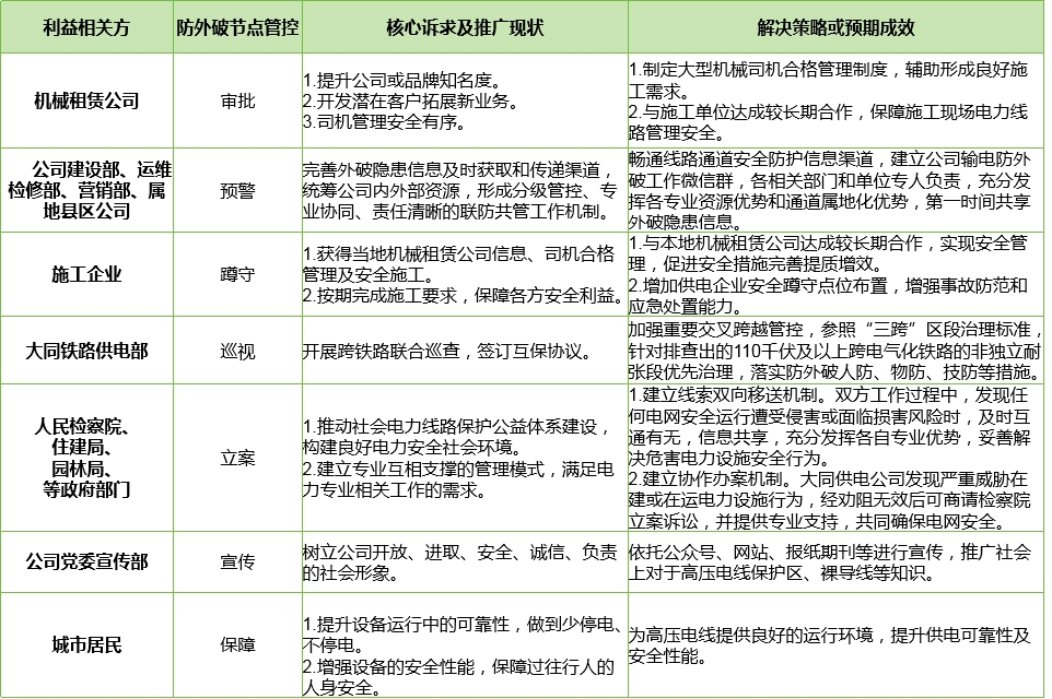 針對(duì)利益相關(guān)方的“五力”優(yōu)勢(shì)(組織力、決策力、監(jiān)督力、協(xié)作力、影響力),明確核心訴求和責(zé)任邊界,建立大型機(jī)械司機(jī)合格管理、臨時(shí)施工備案信息共享、施工固定點(diǎn)蹲守防護(hù)、鐵路安全互保協(xié)議、檢察院公益訴訟等多維度輸電線路防外破治理體系。