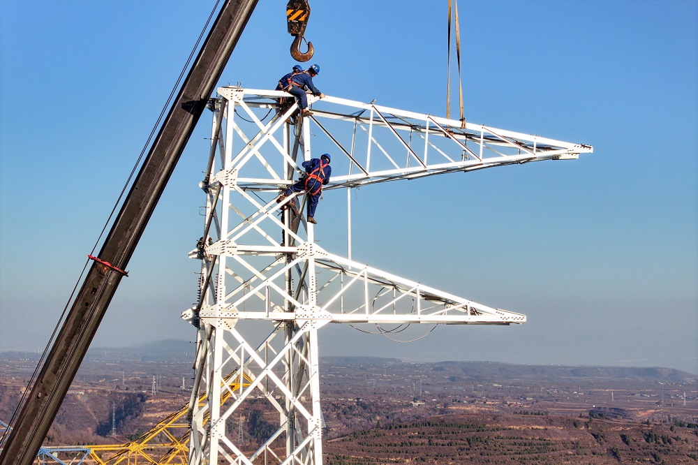 11月25日,國網(wǎng)運城供電公司施工人員正在220千伏桃平線防覆冰改造工程現(xiàn)場組立鐵塔。